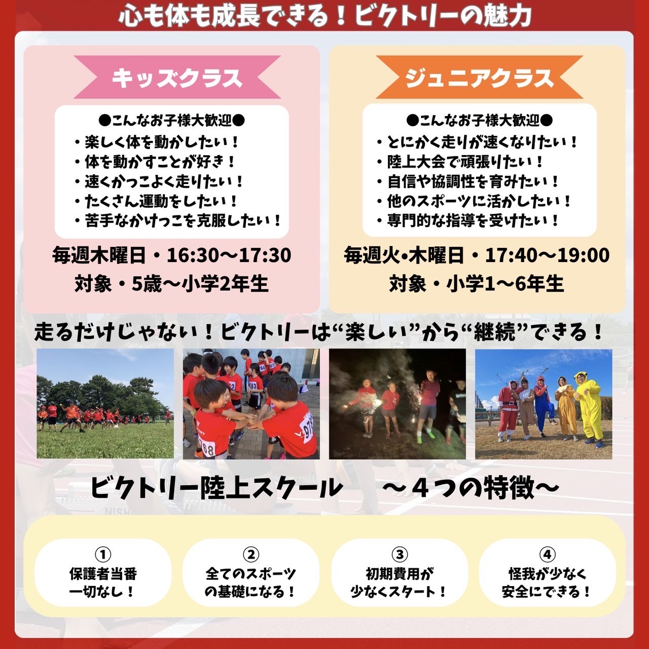スクールの詳細は下記、幼児・小学生・中学生以上の全年代対象の習い事・ビクトリー陸上スクール(神奈川県海老名市・大和市・相模原市・平塚市・秦野市・小田原市・厚木市・横浜市)のホームページをご覧ください。