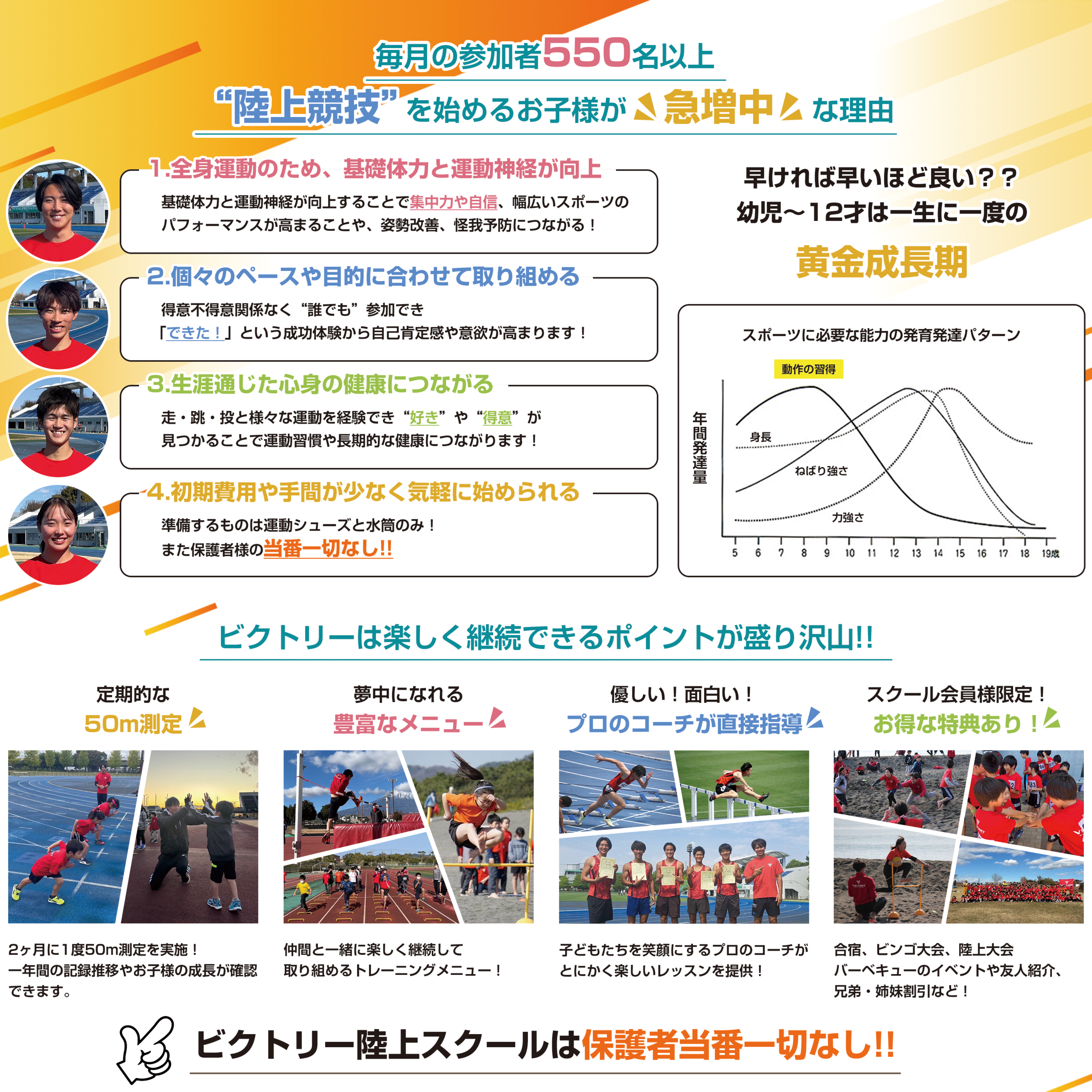 ご来場いただく、陸上スクール(陸上クラブ・陸上教室)や少人数制「かけっこ」教室(走り方教室)では、学区(校区)内ではなくても、幼児(5歳)~小学生の子ども達は参加が可能!